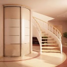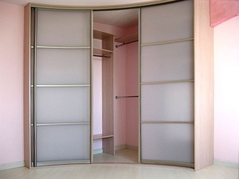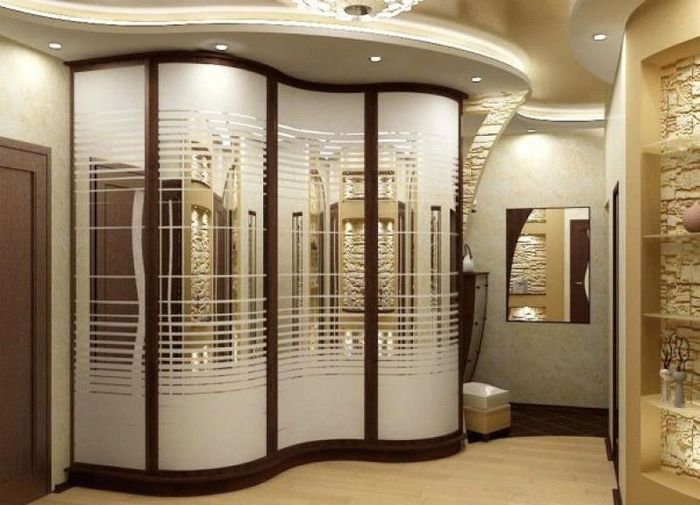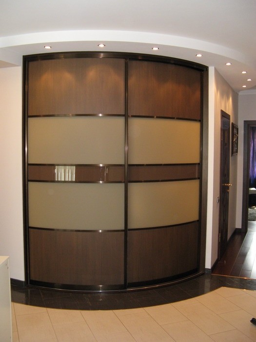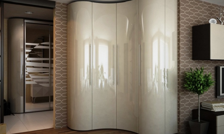 In any hallway a concave radial cupboard will look very elegant. It can have an asymmetrical shape and beautiful smooth lines. The doors of this product are usually glass. They may have wooden frames. As a rule, they are decorated with elegant patterns, colored glass, stained glass or sandblasted ornaments.