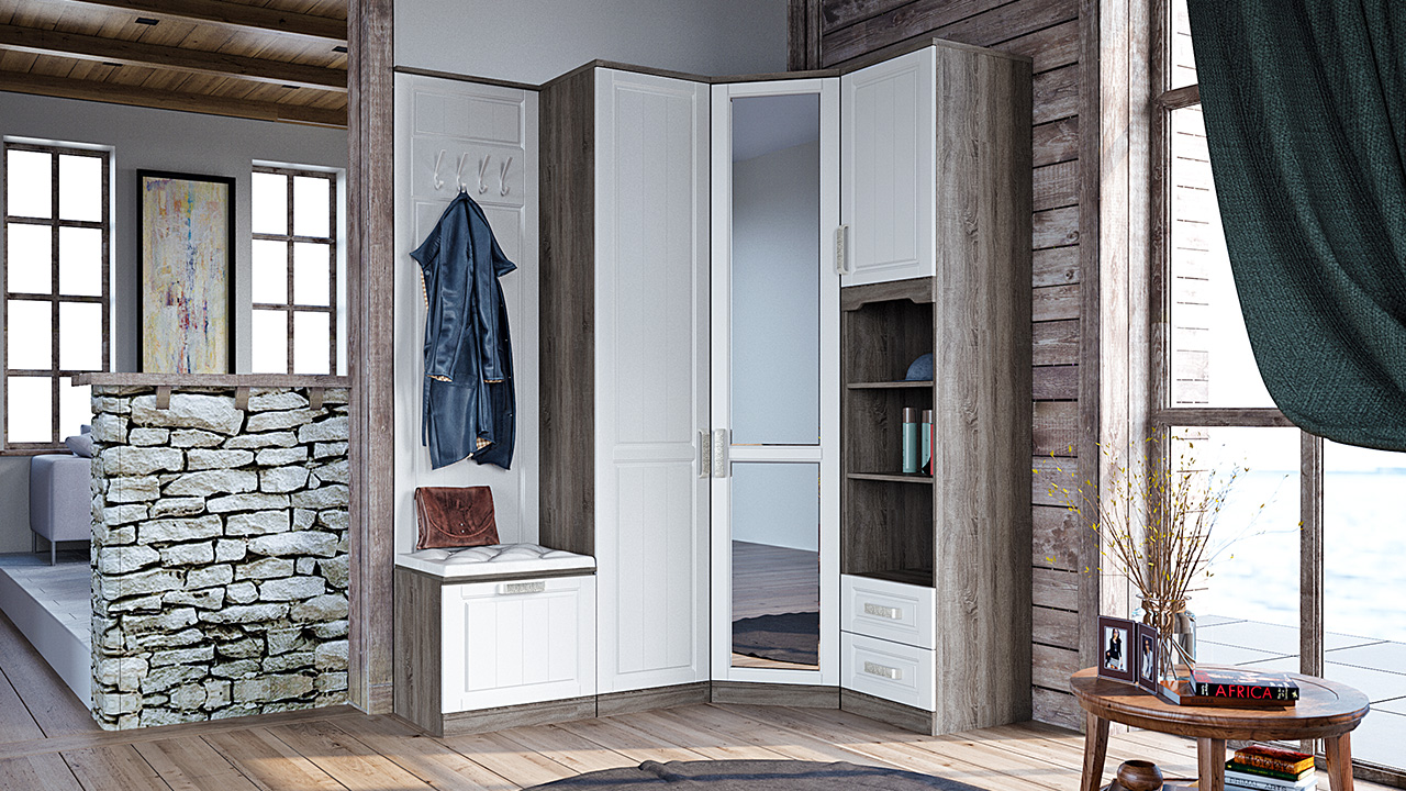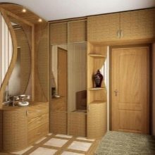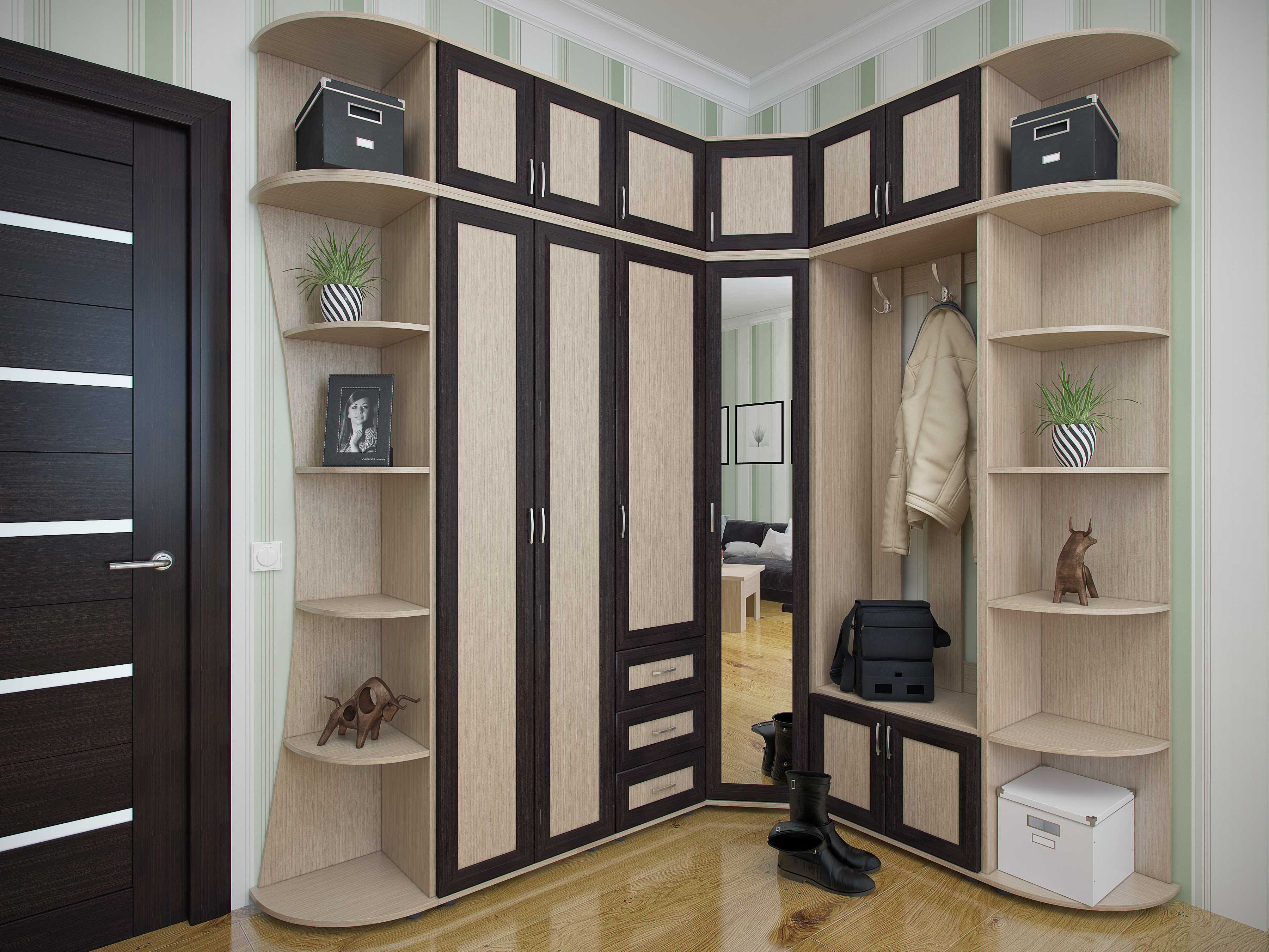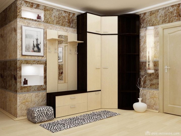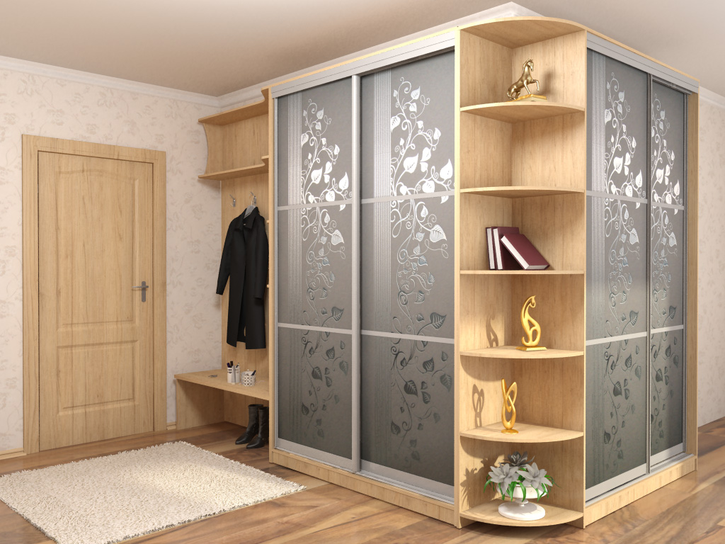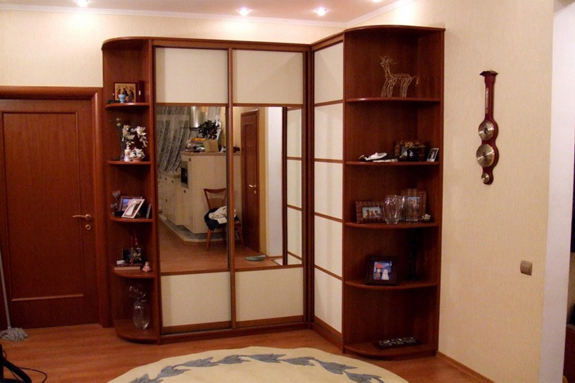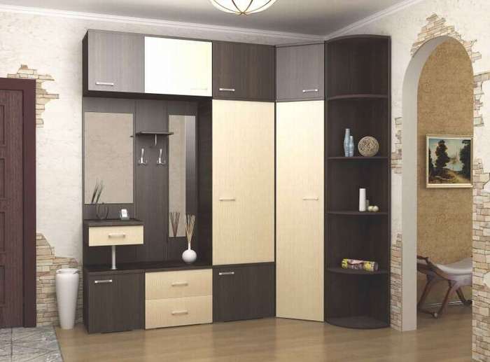 Pentagonal cabinet is the most popular option for installation in the hallway. It can be either hinged models with traditional doors, or models with compartment doors. Two walls of this cabinet are installed at an angle of 90 ° and fit very well, and the side walls are installed perpendicular to each wall adjacent to the corner, and are usually quite wide. Filling this cabinet is considered very convenient, this storage system is the most rational, so it is perfect for installation in the hallway.