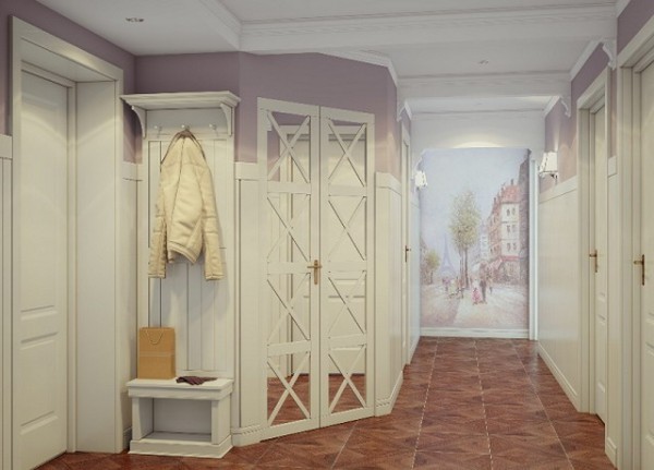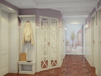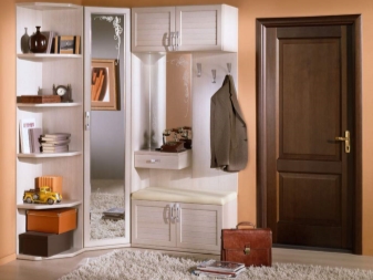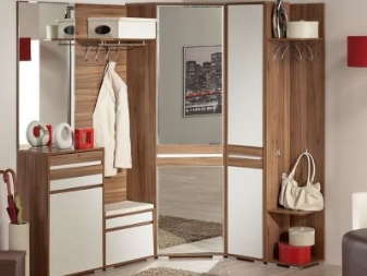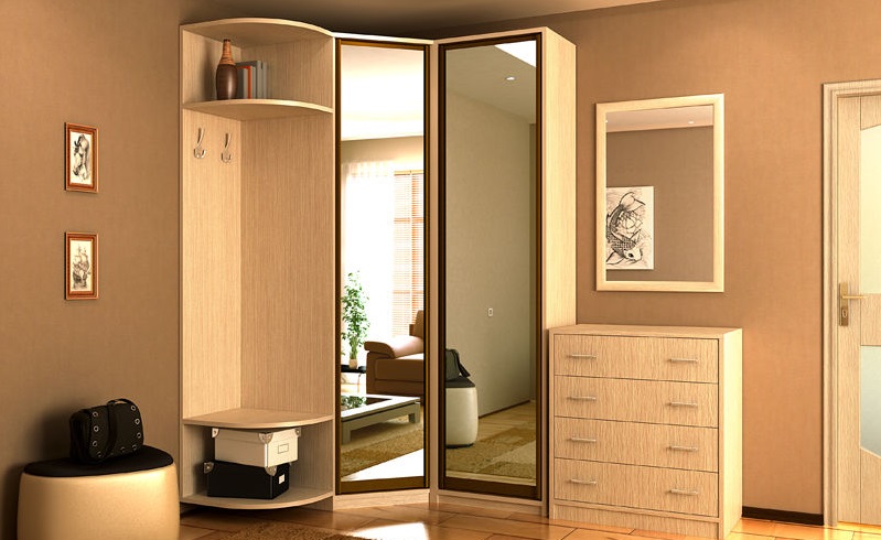 Very elegant in the interior of any hallway looks like a closet that has doors with a mirror. Mirror compartment furniture looks very stylish and luxurious. This design fits perfectly into any interior style. You can buy a beautiful corner model and supplement it with a small table and ottoman for pereobuvaniya. Then the design will complement the interior with a few more small pieces of furniture, so it is very comfortable.