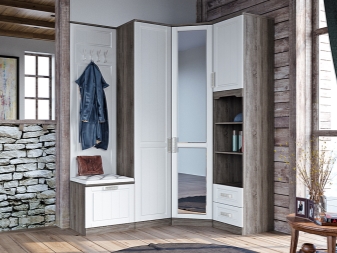 Most often, manufacturers use mixed materials such as chipboard or MDF to create corner coupe models for the hallway. This is due to the fact that they have a low cost and at the same time a long service life. Wood for furniture in the hallway is used infrequently, since it is quite an expensive material for the manufacture of large furniture.Large products for the hallway are not always suitable, therefore, prefer lighter non-natural models.