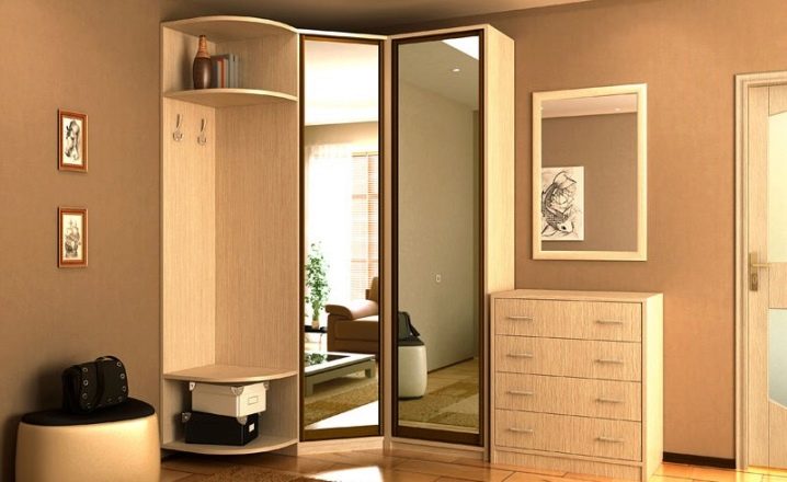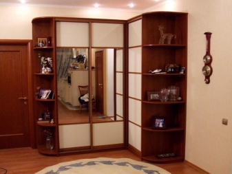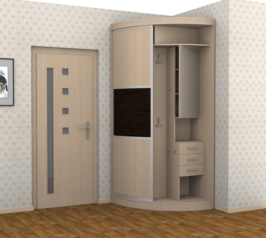 Very comfortable are trapezoidal corner cabinets. The side walls of this product are installed at an angle, which excludes the possibility of installing furniture near it closely. This is a very convenient design, which is very often purchased for small hallways.It has a convenient filling and is very versatile. Radius cabinets look very interesting. This is a rounded model. They can be concave or convex. The latter are very rarely installed in the hallway, since they take up quite a lot of space.