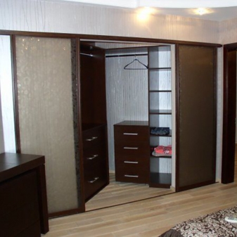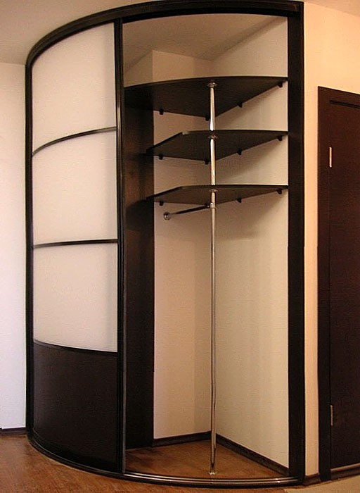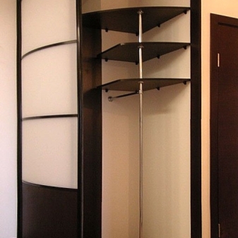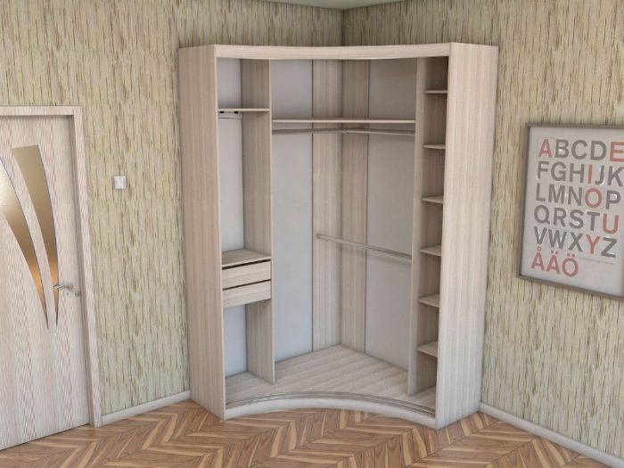 The big advantage of such cabinets is their compactness. This particularly applies to corner wardrobes. It can be installed even near the door, since this design does not require space for swinging the leaves. In addition, these cabinets have a large number of shelves and drawers, so they are very convenient to use. Corner cabinets are the most versatile because they have a variety of filling in the form of hangers, shelves for shoes, chest of drawers.