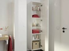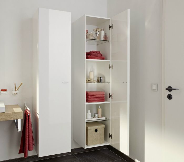 - For bathroom narrow closet fits perfectly. It can be installed near the sink and put there a lot of things that all the time should be at hand. For example, towels, toothbrushes and various hygiene items. Since the dimensions of the room itself are usually small, you can not only install the cabinets, but also hang them. The ideal option for furniture in the bathroom will be plastic doors.