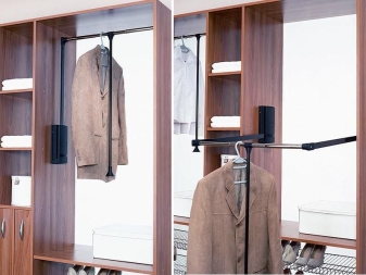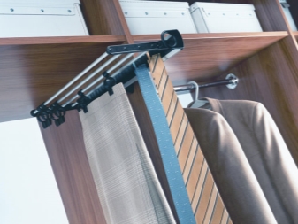 Most often, manufacturers produce sets of furniture with a standard type of hangers, but among them there are exclusive original versions. For example, sliding mechanisms with a pantograph descent are used in products high enough to save maximum space at the bottom of the cabinet. With the same success using conventional or end hangers, so that you can hang hangers.