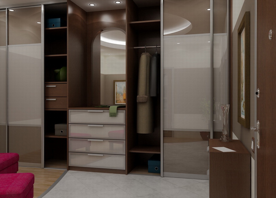 - In the hall arrange a beautiful wardrobe is not difficult. These rooms have a small space, so the cabinet is either built into the wall, or they use all possible angles to rationally fill the area. Such products are mixed and filled not only with shelves, hangers, but also with drawers. Also the hallway does not appear without a mirror that will bring more light into the room;