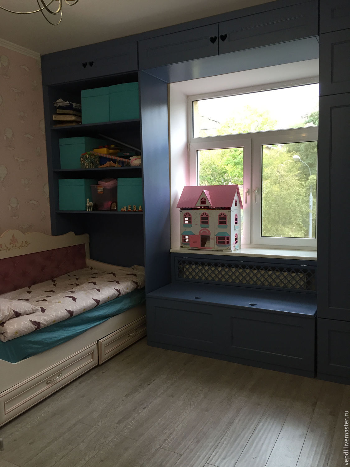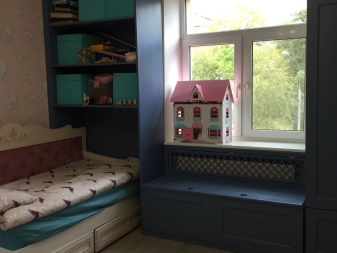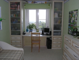 An interesting, practical and original version will be the placement of the product around the window.So you can effectively save space, create an unusual room design. At the same time directly at the window you can arrange a desk where the child will be engaged. The composition of the built-in wardrobe and table will look very stylish. The room in an instant will acquire harmony and balance. In this case, it is better to place the cabinets on either side of the window. Above and below can be shelves where the necessary things fit.