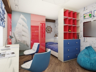 Convenient and comfortable in the boy's room will be the wardrobe. It can be conveniently placed even in a small area. The advantages of this model include the fact that the doors are easy and convenient to move apart, while not occupying additional space. Thus, it will be possible to place such options even in the most compact room.