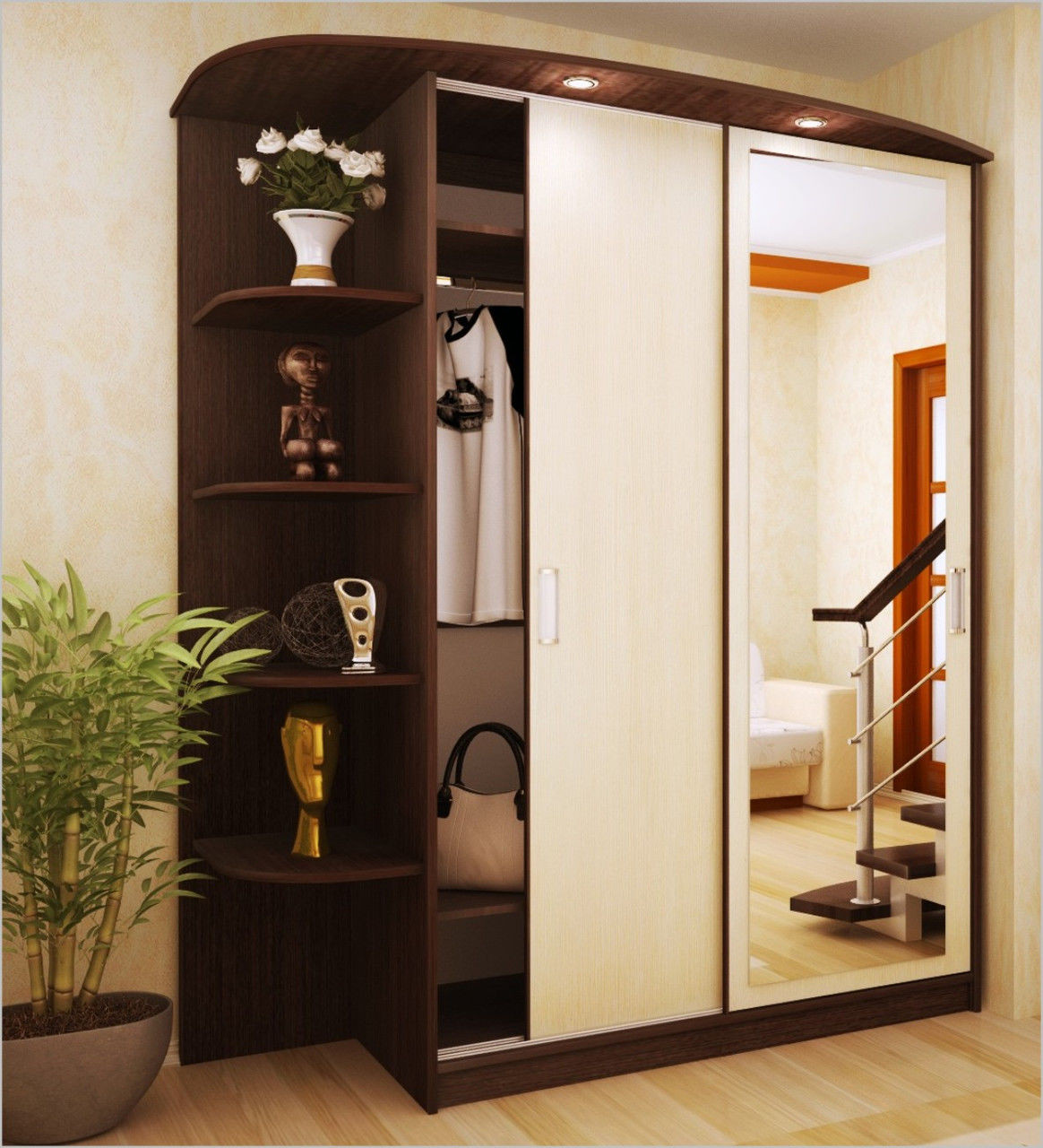 - Corner Cabinets in the hallway vary depending on the shape, size and location. They can be in the corner between two doors, being very compact designs. The angle in such a cabinet is made in a straight line, unlike other more dimensional models, which are made in a curved shape. A compartment with sliding doors is often a convex shape, which makes the model more overall than its straightforward counterpart.