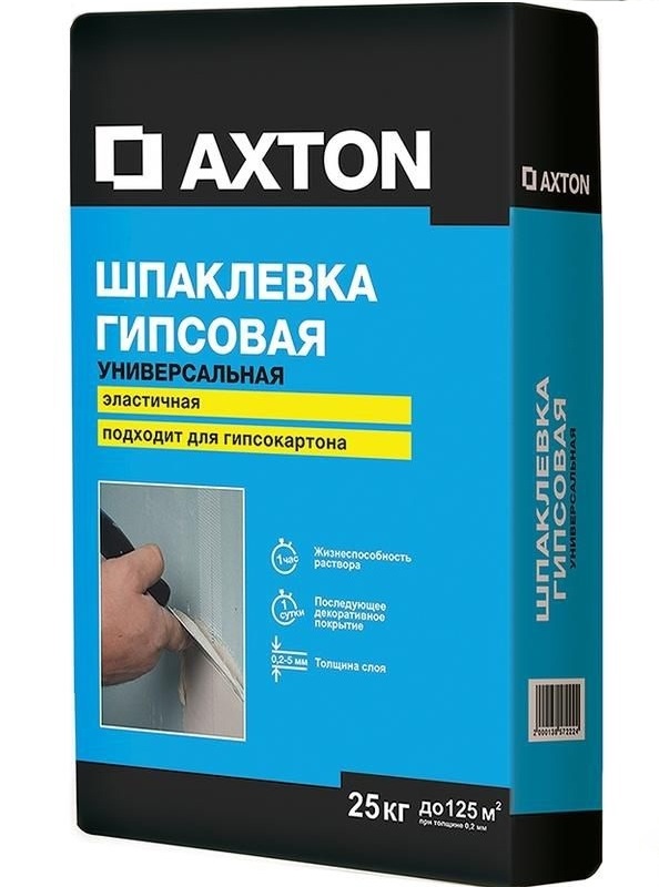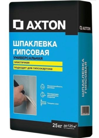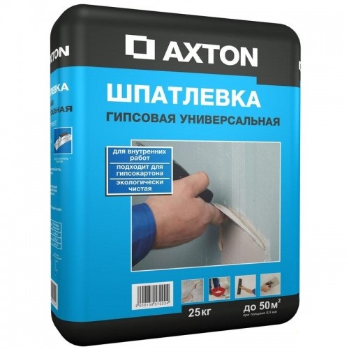 Putty Axton is a unique composition for rough work with wall coverings. In the mixture there is a small fraction of gypsum with the addition of elements for excellent adhesion and enhancement of plasticity. After preparing such a solution, it can be used for only 1 hour, so there is no need to knead the whole bag at once: it is unlikely that you can apply such a volume to the wall in 60 minutes alone. The duration of drying of such a mixture is 20-22 hours (during this time it completely hardens).