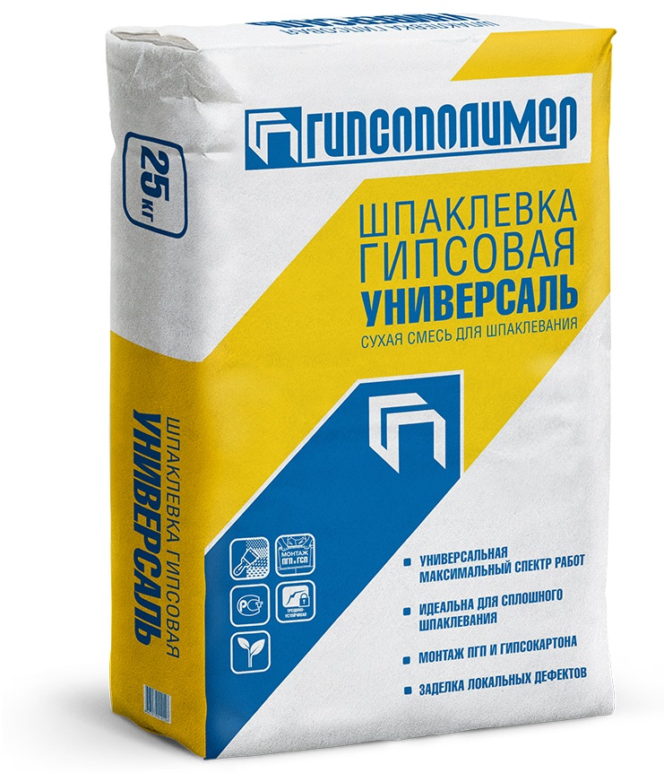 Putty "Universal" of the company "Gipsopolimer" 25 kg packing is more often chosen in order to level the walls with various types of surfaces, as well as for repairing wide joints, filling cracks and other irregularities. It is used for interior work in rooms with the usual level of humidity, including the kitchen and bathroom, as well as for finishing the surfaces of the walls of children's and medical institutions.