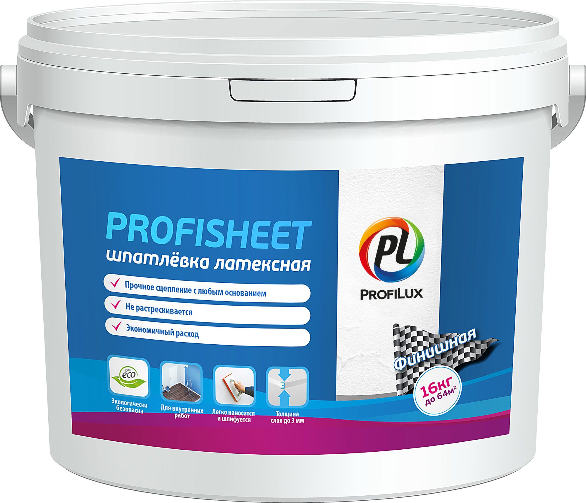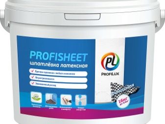 Latex putty is produced under the name "Profilux Profisheet". This material is produced ready for application. Used to level various indoor surfaces.. Allows you to get a perfect white finish. After drying the mixture forms a durable coating that is resistant to moisture and mechanical stress.