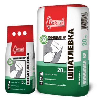 - Finish The purpose of its application - the creation of a perfectly smooth layer, which later will be attached decorative trim. It does not require grinding and leveling due to the fact that it is applied in thin layers and consists of smaller particles.