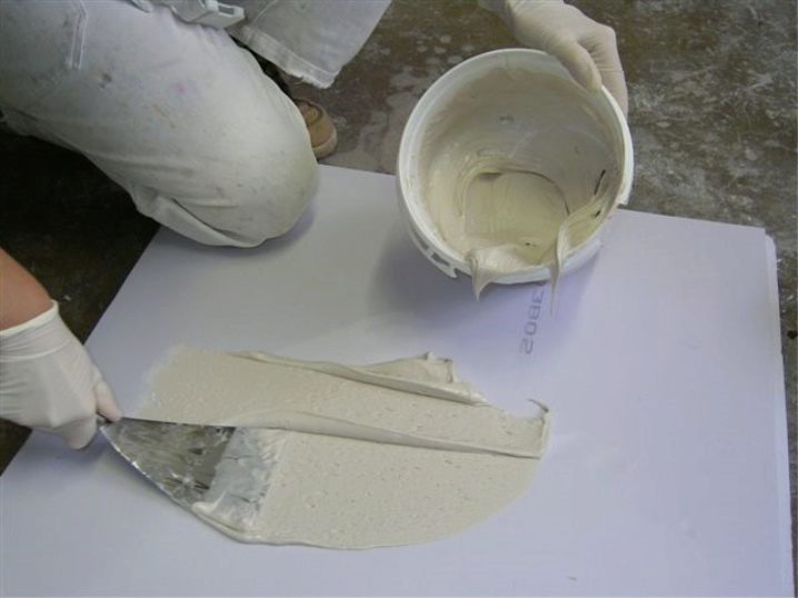 The main components are cement, resins and artificial fibers. It is a universal composition, as it is suitable for any surface.