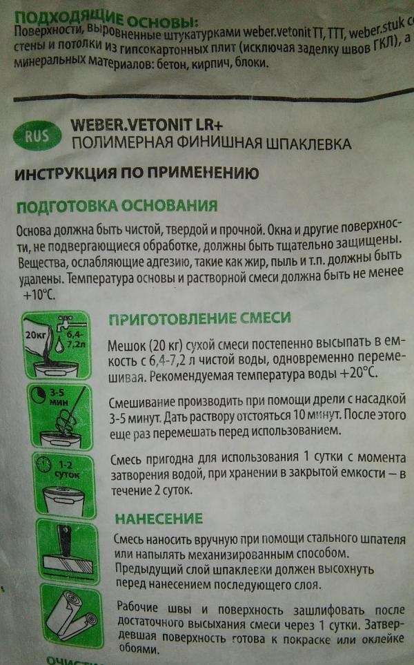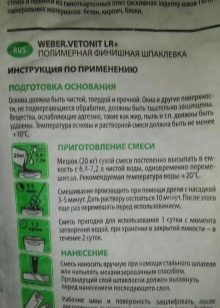 - Carefully read the instructions.because there must be indicated for which sphere and for what purposes this or that modification of putty is intended. It is necessary to clearly distinguish starting, lighthouse and finish putties in composition and select at least two different options for layer-by-layer application. Mixture for indoor use, such as a bedroom or office, is not suitable for processing the facade of a house or sauna.