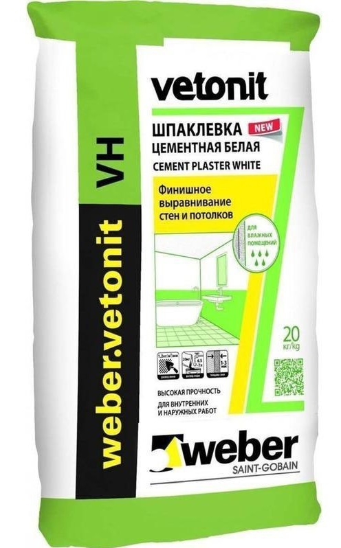 - Cement based putty It is used mainly for technical rooms where there is no constant heating, as it withstands temperature changes and high humidity well. These qualities are indispensable in the decoration of the kitchen or bathroom, where water fine suspensions are often deposited on the putty surface.