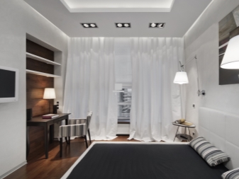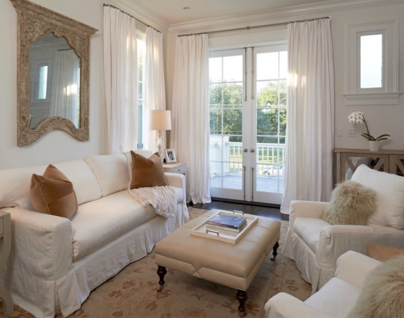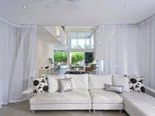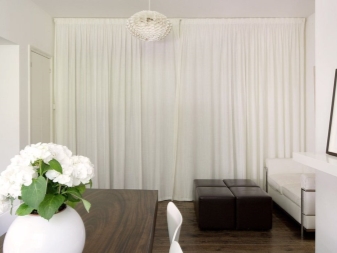 - Long white curtains are able to create the appearance of a high ceiling and visually expand the space.