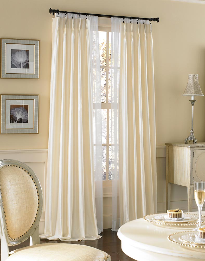 - Silk white curtains are valued primarily for their amazing appearance and high durability when used. Natural silky or satin material is able to protect from direct sunlight, repel dust, dirt and decorate any room. Among other things, it is hypoallergenic due to the fact that it consists of protein and is similar in composition to human hair. Natural silk produces a large number of fabrics for curtains, which differ in appearance, density, composition, type of interlacing of threads and method of processing.