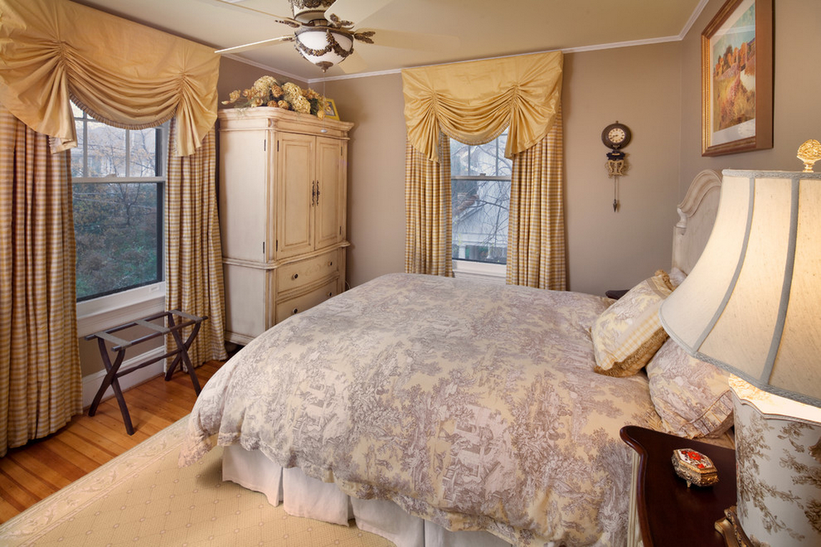 - Bedroom window decorated in the style of Italy, will make the room cozy and warm. You can add a little romance using flower-patterned curtains. In this room it is better to choose curtains of calm pastel shades. To adjust the degree of illumination of the room they are combined with roller blinds.