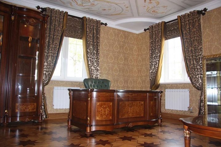 - In the office It is recommended to choose a more stringent version of curtains. They are also selected in accordance with the color palette of the room. The office should look neat, but without excesses, so that nothing distracts from work.