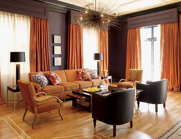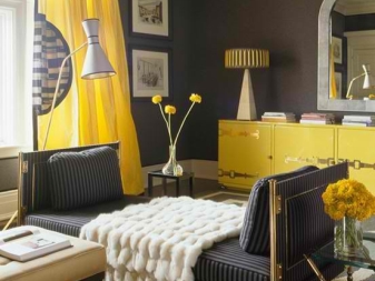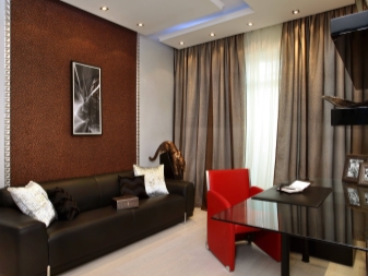 The basic principle of creating a harmonious ensemble is to select the color of the curtains to match the wallpaper. Brown wallpapers can be cold or warm. For the cold tone of the wallpaper, the partners will be golden, wheat, purple colors of the decor. Textiles of carrot, yellow, red, pink colors fit to warm brown tones.