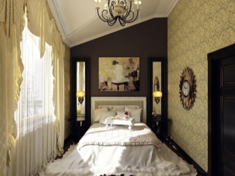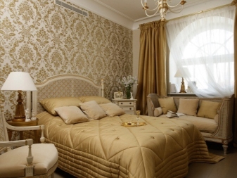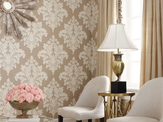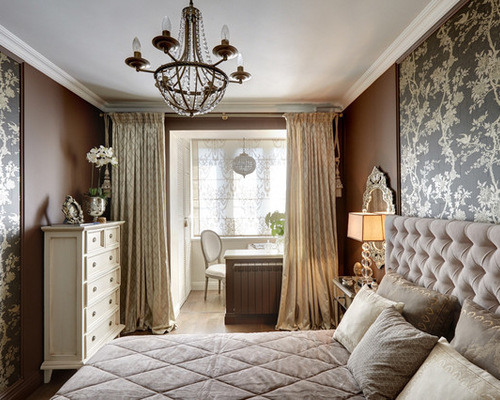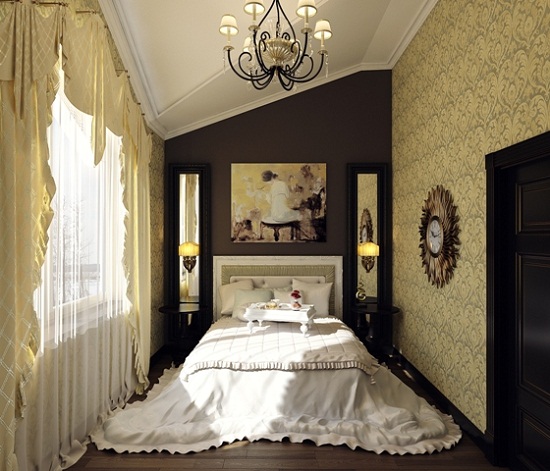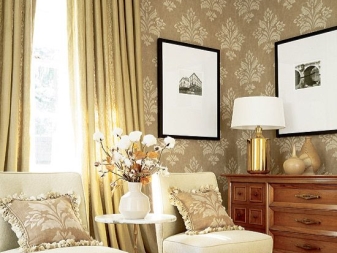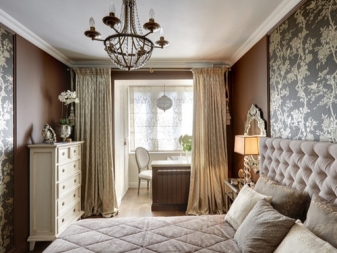 The third design option is the selection of curtains of the same color as the wallpaper, that is, brown.In this case, you can make the room too gloomy. However, if the wallpaper is bright white Damascus pattern or golden monograms, the curtains with the same pattern or color will create an ensemble in the classical style.