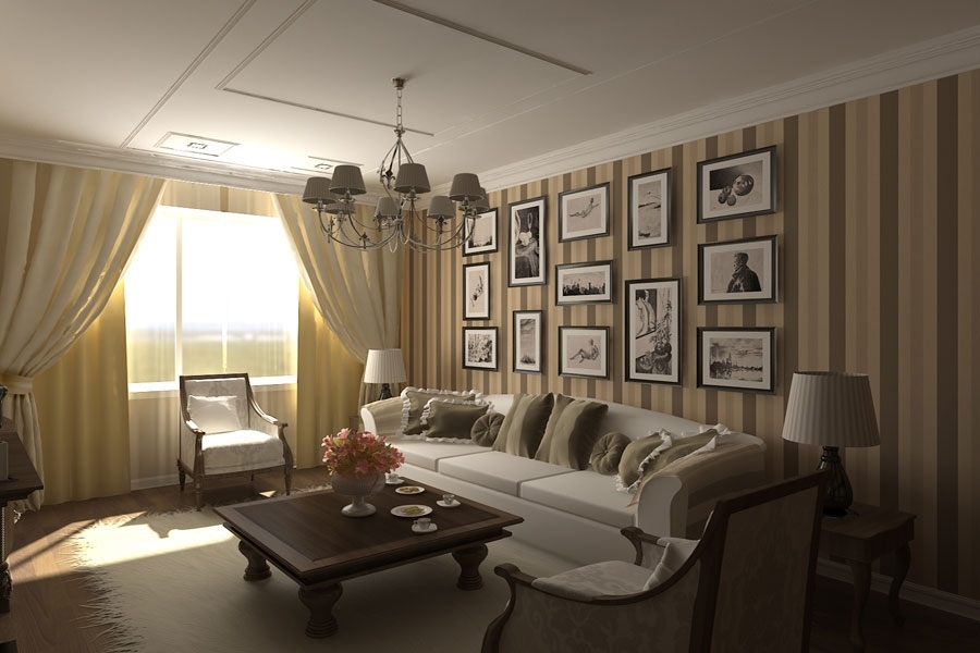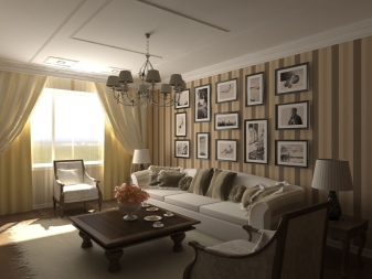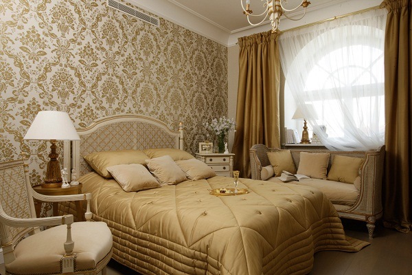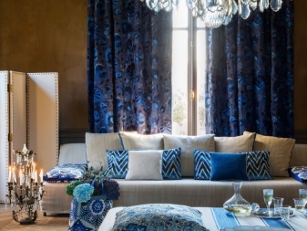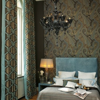 The simplicity or complexity of the wallpaper pattern determines the design of the curtains. The classics require a Damask pattern of wallpaper, golden bouquets on a canvas wall, a golden thread in textiles. Lambrequin will be an obligatory element in such an interior. Lambrequin can be single, made of fabric curtains, and can be difficult, with the inclusion of the assembly of tulle. Tulle in such compositions, as a rule, white, cream, coffee or soft blue.Royal sophistication gives blue color to curtains with a gold pattern in combination with gold monograms on a brown background.