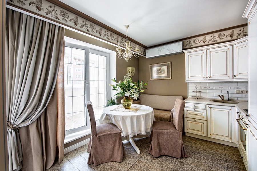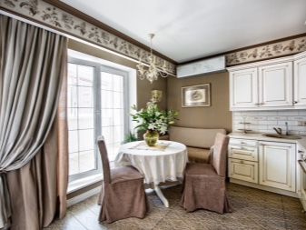 The interior can be made out in nuanced combinations. Brown walls are shaded by curtains of similar tones - beige, cream, pink.