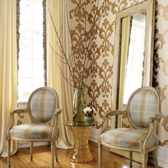 If the wallpaper is embossed, then the texture of the fabrics can be more voluminous. Flower relief wallpaper will not look with curtains "matting". The interlacing of the "matting" will well complement the same wallpaper tie or geometric relief. Convex monograms look good with striped curtains in the English style or plain.