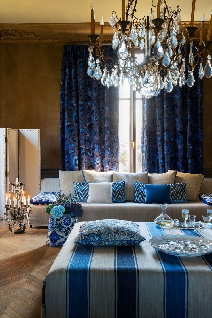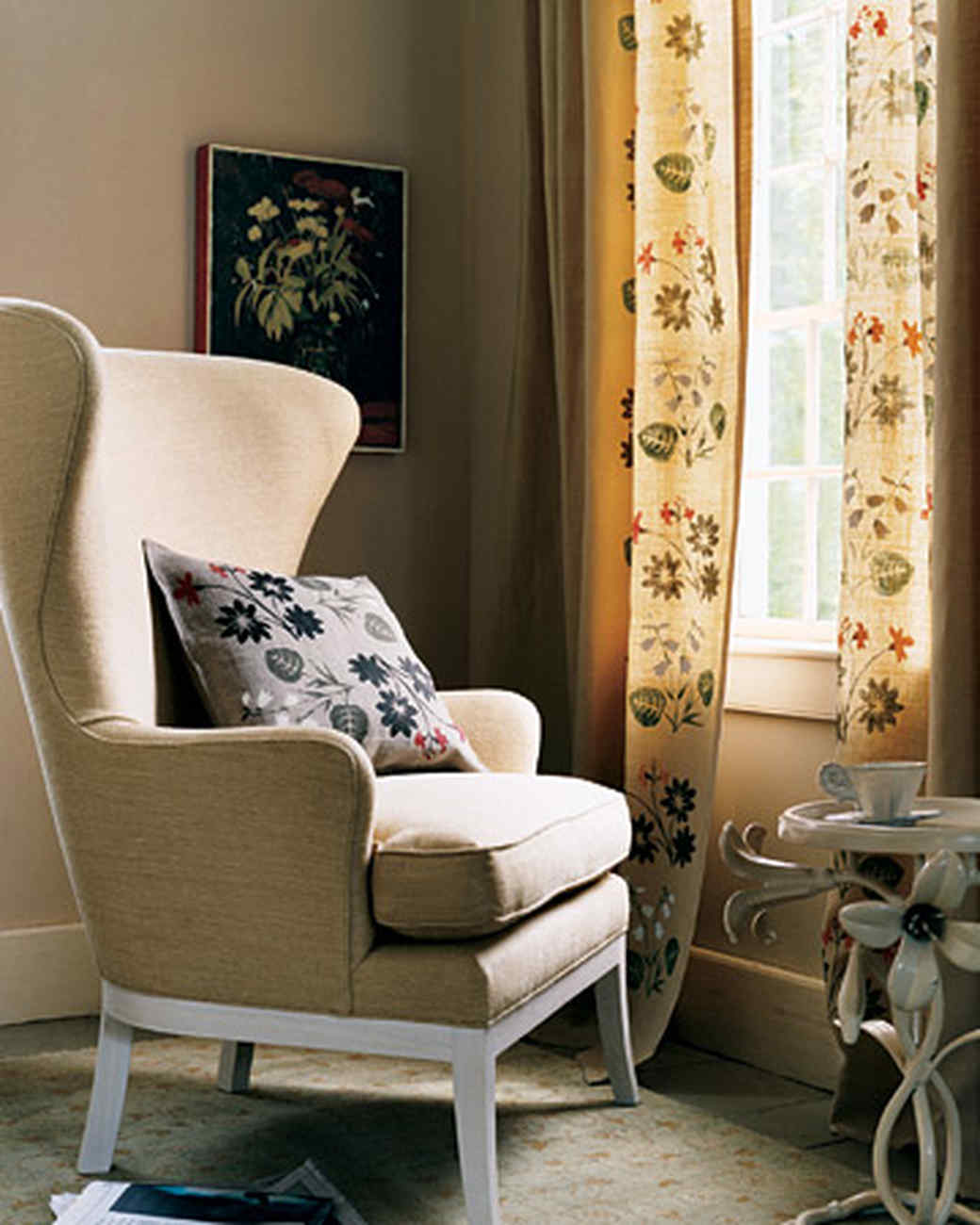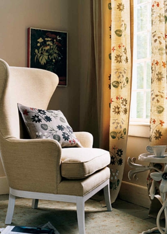 Striped wallpaper compositionally complemented with textiles monophonic or with flowers. Flowers can be stylized or naturalistic in the tones of strips on the wallpaper.