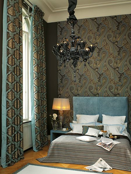 Wallpaper with damask pattern perfectly combined with plain curtains in the color of the picture.