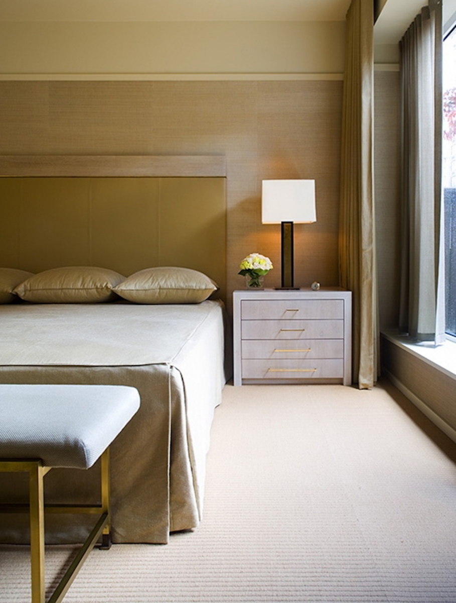Classic gold monograms on brown wallpaper perfectly complement the golden curtains of brocade in the Empire style.