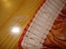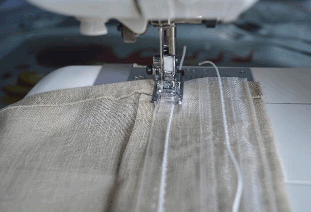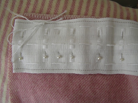 - On the hem, put the curtain tape with the pockets upwards, departing from the top edge of 0.5-1 cm. At the same time, the tape should be 3-4 cm shorter than the fabric at the edges (depending on the width of the double fold, 2x2 or 1.5x1.5 cm).