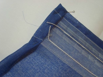 Second way also begins with the choice of fabric and processing the edges of the product. Next, the upper edge of the curtain or tulle should be bent to the wrong side to the width of the curtain tape plus 0.5 cm. Before sewing the tape, it is bent at both edges 2 cm inwards, after releasing the laces. Attaching the tape close to the side edge you need to make a quick-look and then stitch on a typewriter.