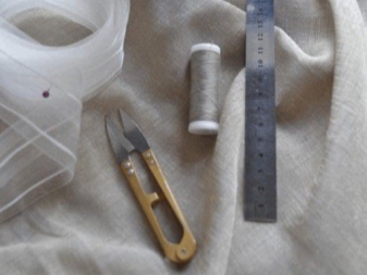- Processing curtains or tulle, depending on what was chosen for the combination with ribbon. This applies to those types of fabrics that have a crumbling, non-factory bottom or side edge. In this case, it must be treated with a double-hem seam. For ready-made curtains, which only need to sew tape, no manipulation is required.