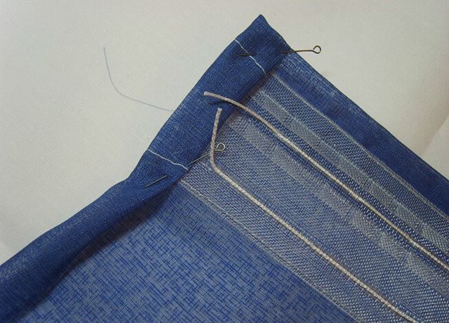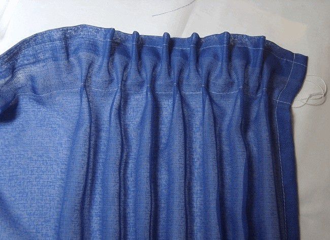 - The curtain is ready, it remains only to pull the laces to form the folds, distribute them through equal distances and attach the hooks (if the type of fastening means). The side pockets with this method are not stitched, so they can be attached to the laces in the tape.