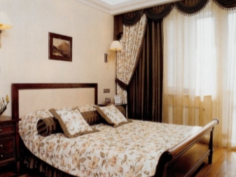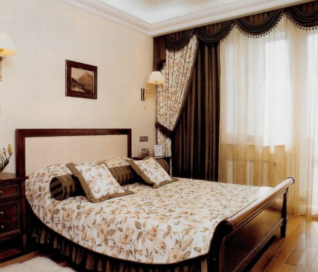 Fabric brown shades fit into the bedroom as a night curtain, protecting from light. Warm tones will give comfort, and cold tones will bring peace. Dark brown curtains with a lambrequin will add a zest to a room with a white ceiling and light wallpaper.