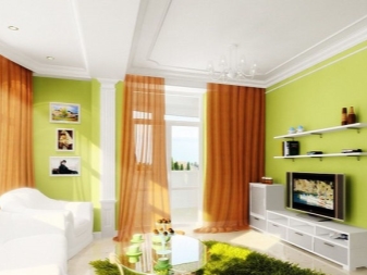 Combining colors in the interior is as important as choosing the curtains themselves. The brown-colored curtains are wonderfully combined with the white, blue and light green colors of the living room. However, for some shades of green it is better to choose not dark, but light curtains with a matte surface: