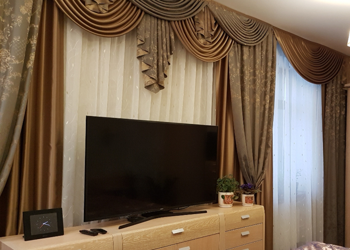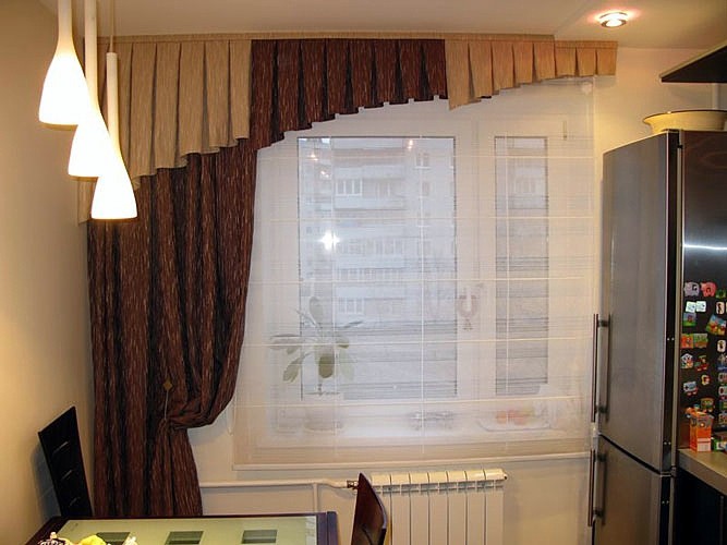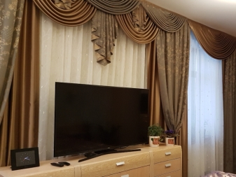- pelmets - decorative window decoration, located horizontally relative to the top of the curtains.Combined with the first type of curtains, they are used in halls, living rooms and in kitchens;