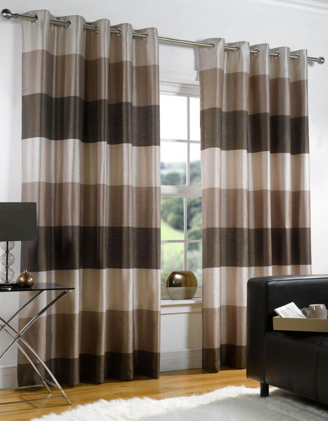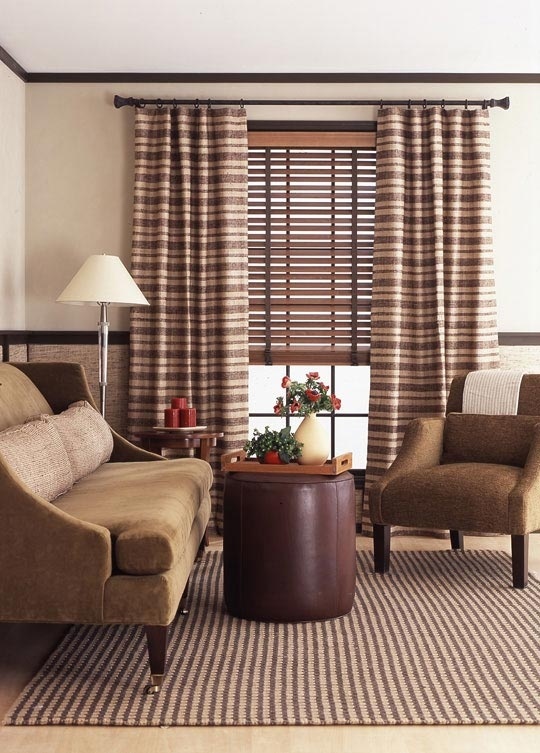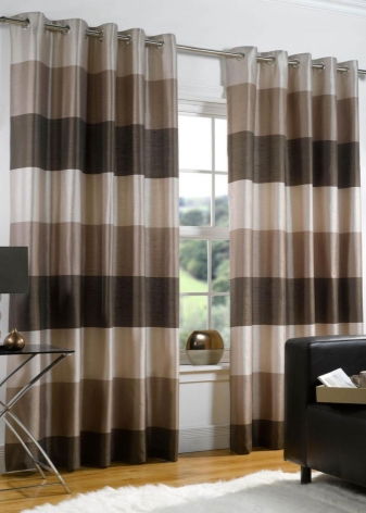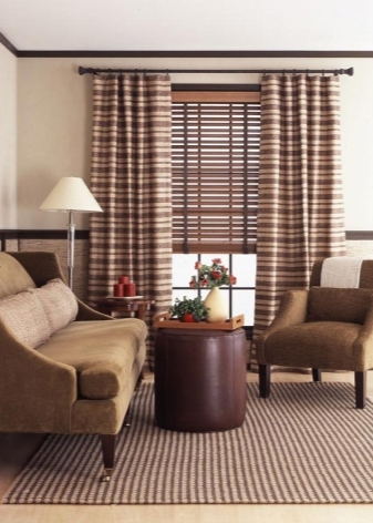 Striped curtains of brown tones are perfectly combined with dark furniture and wooden floors. They link all the colors of a room into a single composition. This option is best suited for framing a large window.