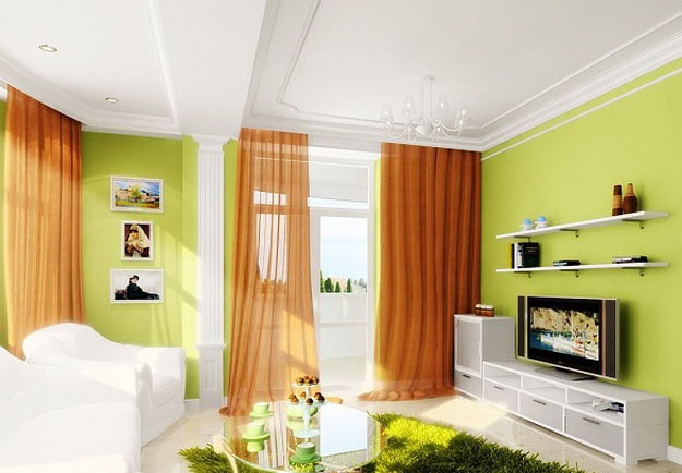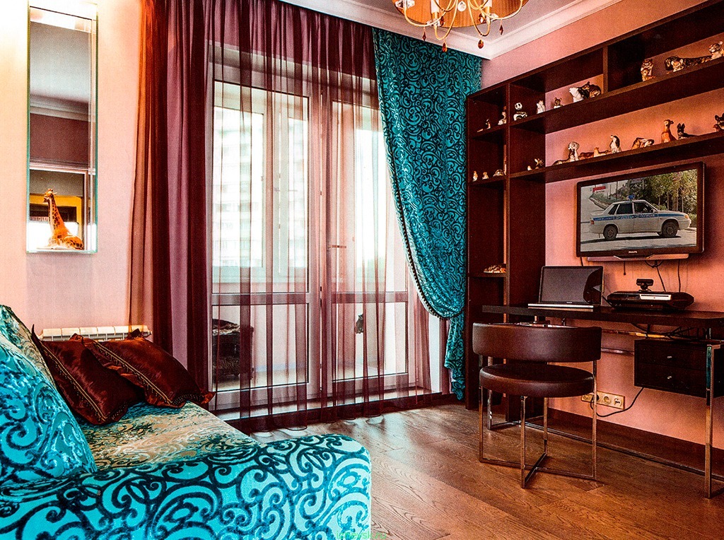 - Another great option: lime wallpaper and coffee curtains with turquoise or olive furniture. In order not to get tired of such a saturated color in the interior, it is added quite a bit. The combination with turquoise may seem risky, but it is often used to create a Mediterranean style.