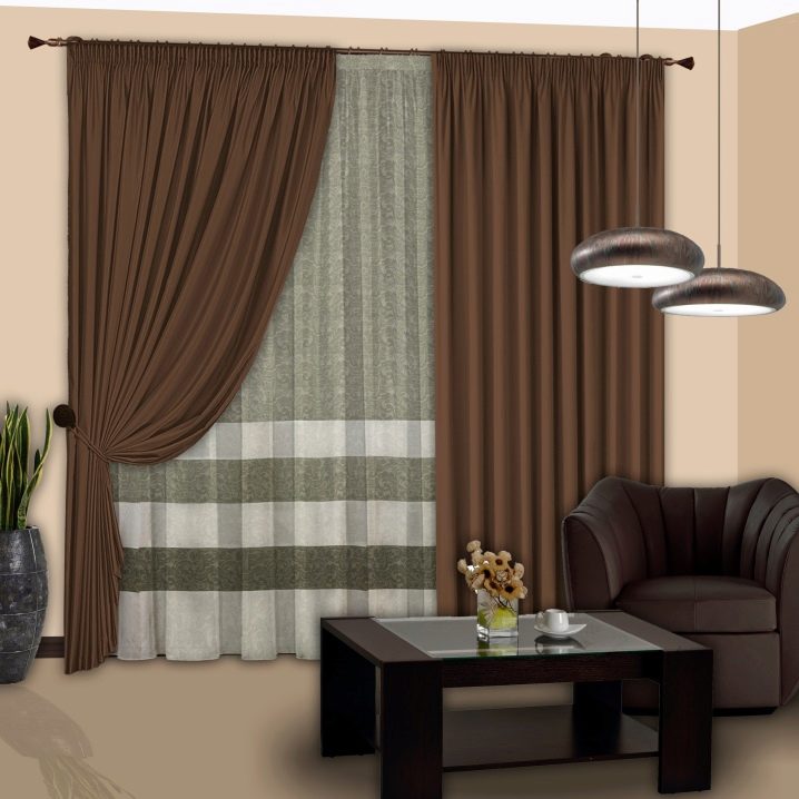 Brown curtains with stripes represent a canvas that is gathered into folds. The Austrian type of product, unlike other types, is assembled only from below. Such curtains, despite their dark color, add lightness to the interior elements.