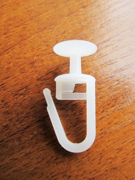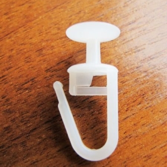 - Plastic is considered the cheapest. Hooks from it will not be able to withstand the curtains, which have a lot of weight, but they are well suited to hold air curtains.The main advantage of such fittings will be silent sliding and sliding of curtains. However, over time there is wear of the plastic, and this leads to deformation and loss of performance.