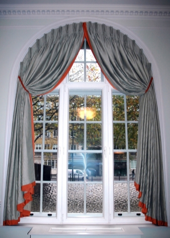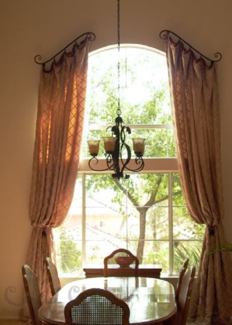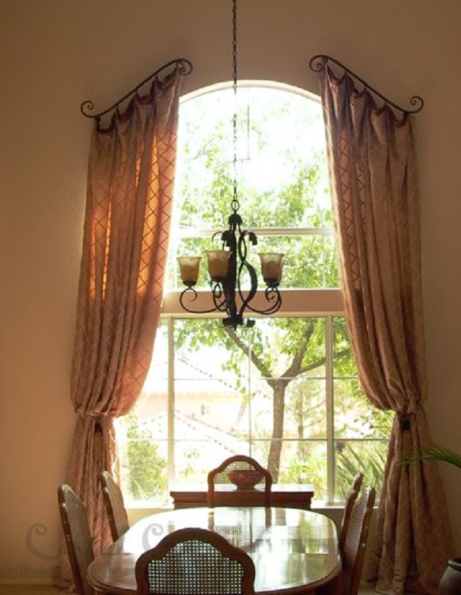 - On the arched window. Fastening with hooks can be used without the eaves. Recently, this technique has become very popular due to its originality. Usually it is used to decorate an arched window. In order to hang the curtain in a similar way, it is necessary to install special decorative or ordinary household hooks for clothes over the opening oval at a distance from each other. Then the loops on the curtain are hung for hooks at different heights. This mount is secure, it can withstand even very heavy drapes.