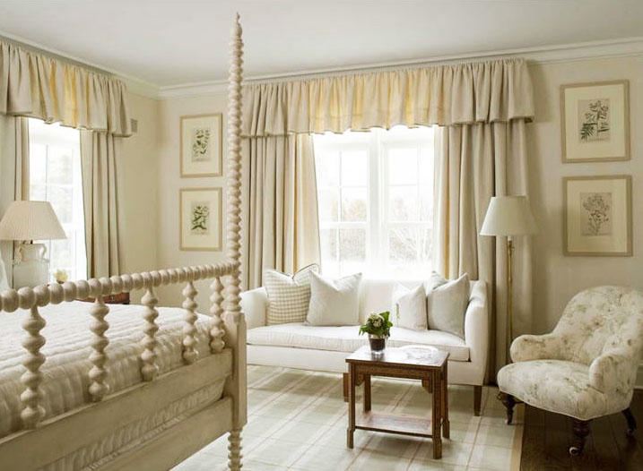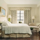 - Some designers recommend choosing curtains and lambrequins to match or a few tones lighter or darker than the main color of the room. If the shade of curtains is chosen to match the bedroom, then the lambrequins should be chosen with a pattern or pattern so that the window design does not merge with the walls and the bedroom as a whole;