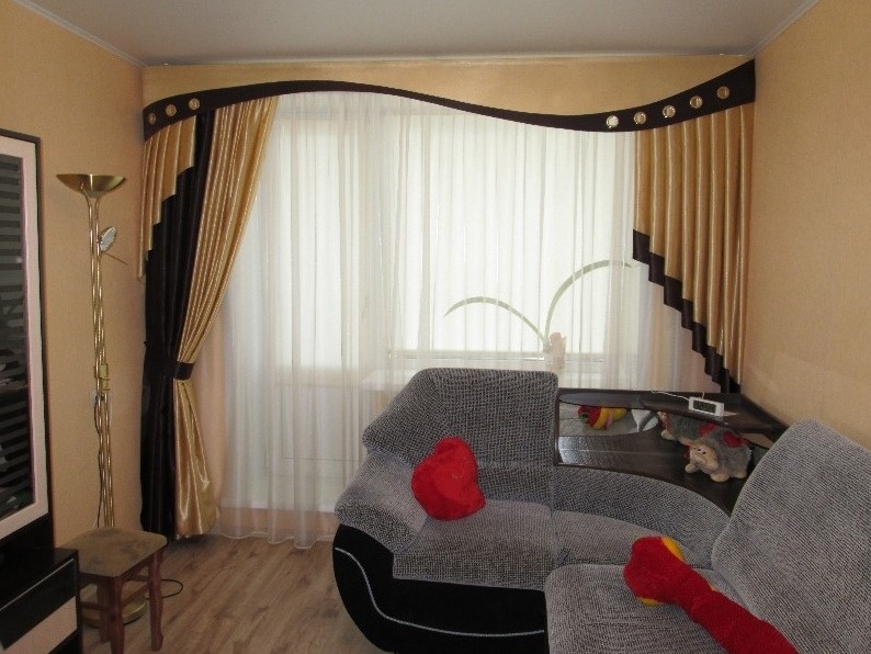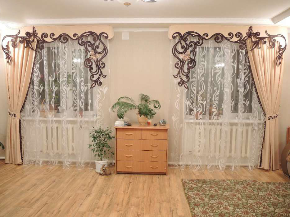 - Some designers use pelmets as independent elements for decoration of a room, for example, to decorate the arch between two rooms, but most often they are complemented by beautiful curtains on the windows to create a more complete look;