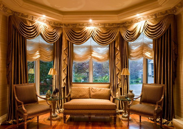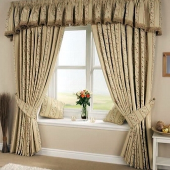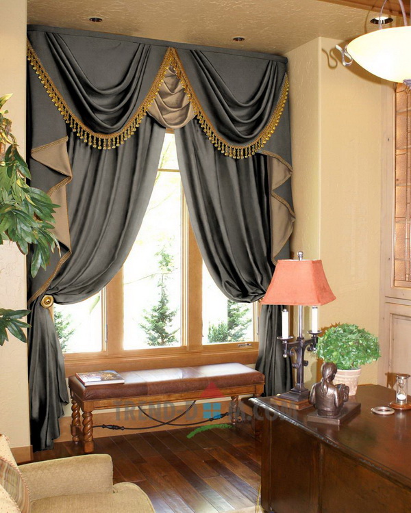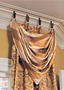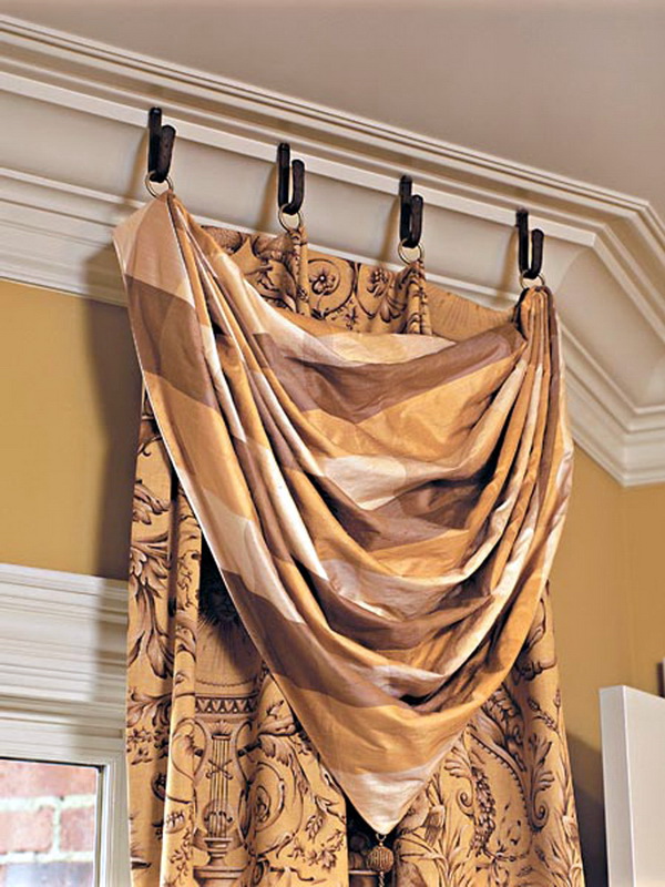 If the window has an intricate shape and install the eaves seems irrational, you can use special decorative holders - spirals or hooks, on which the curtain is hung. The result is smooth, slightly sloppy folds.. In order to avoid sagging of the fabric, the curtains are recommended to be made longer so that their bottom edge lies on the floor.
