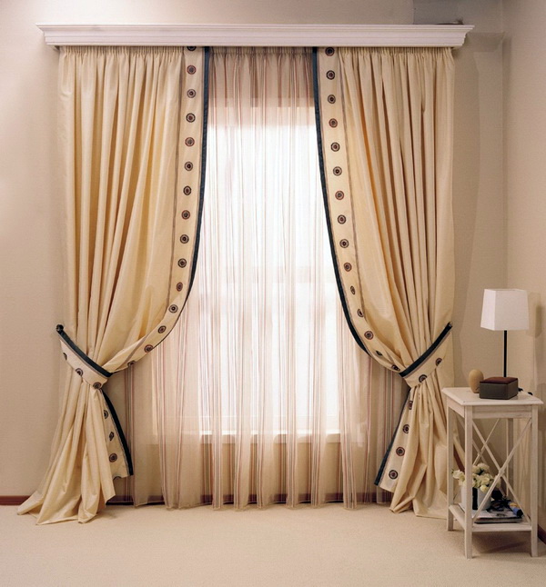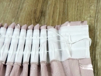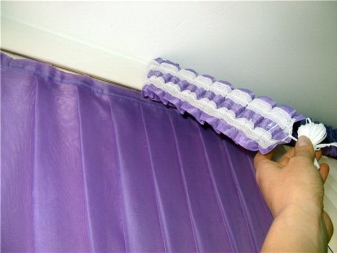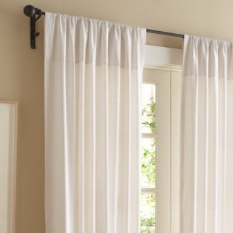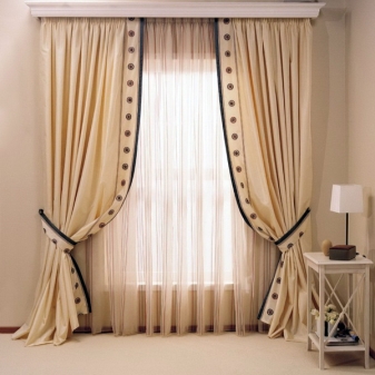 To protect the upper edge of the material, you should use a curtain tape.. There are special tapes for grommets, facilitating work with delicate fabrics. However, this method is far from universal - it is not suitable for transparent light fabrics. You can also hang the curtains on specially stitched loops of fabric that matches the material of the curtains, or of a fabric of a different type and shade. Curtains with hinges can be conveniently hung, moved apart and pushed in without fear of damaging the fabric, however, this method requires a rod in the form of a rod. On the other hand, nets that are neatly made and decorated with buttons or bows look amazing.