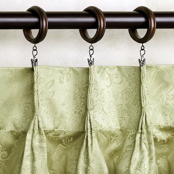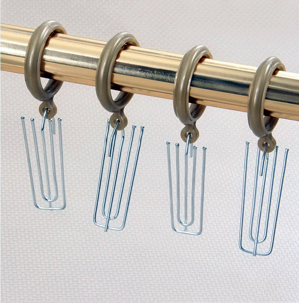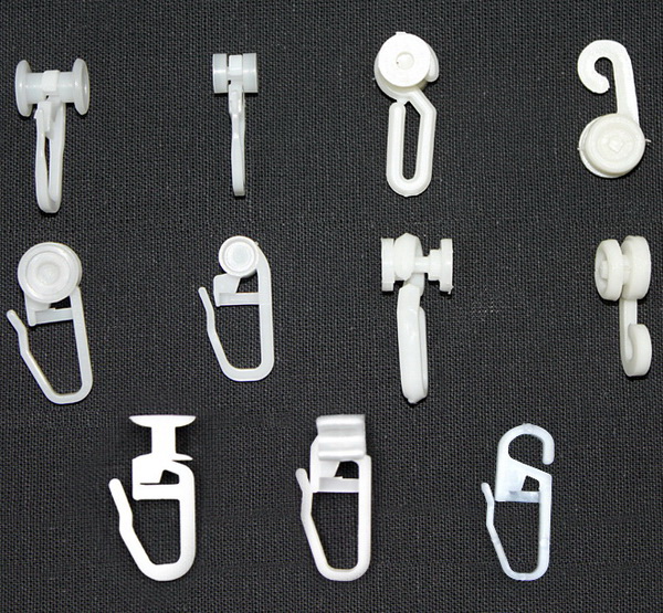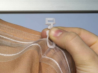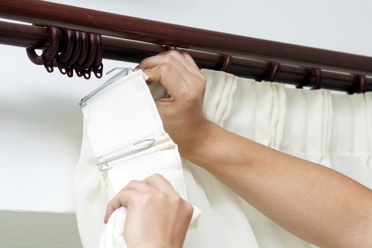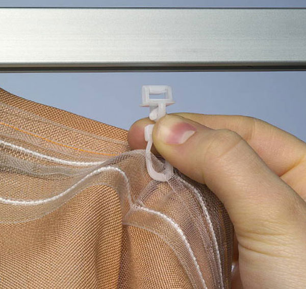 Hooks - this is one of the most familiar types of fastening curtains. For all the simplicity of this method, it also has certain disadvantages: in the place of attachment, heavy fabric is drawn out, thin plastic hooks break, and the decorative properties of this type of attachment are small. You can avoid pulling the material by hanging the curtains on a band or on a curtain tape. Clips are good because they allow you to easily fasten the curtains and manage them with special cables, but you can only use clips for light fabrics. More dense curtains can hang on clothespins that have small teeth. The disadvantage of this method is that even with a slight tension of the fabric, it pops out of the clip.