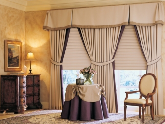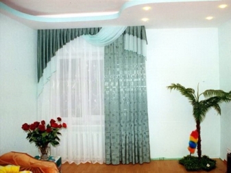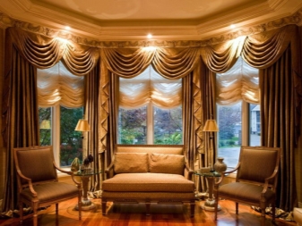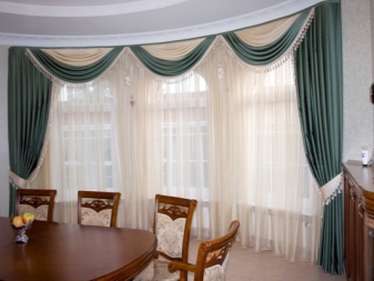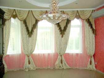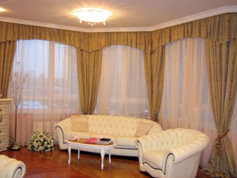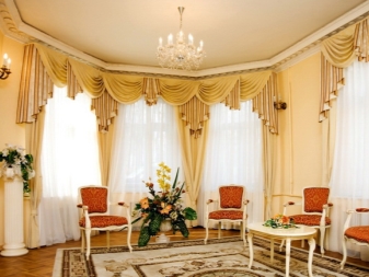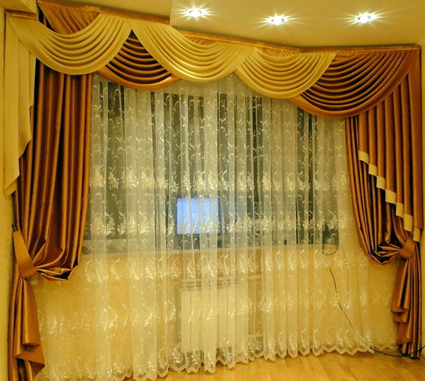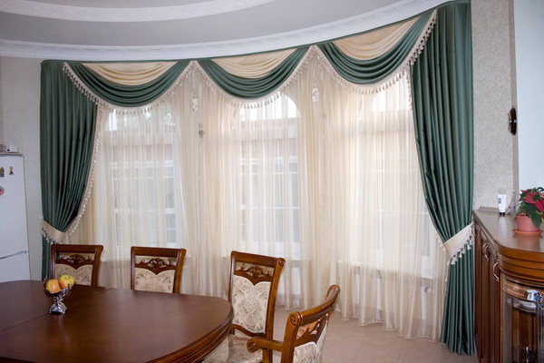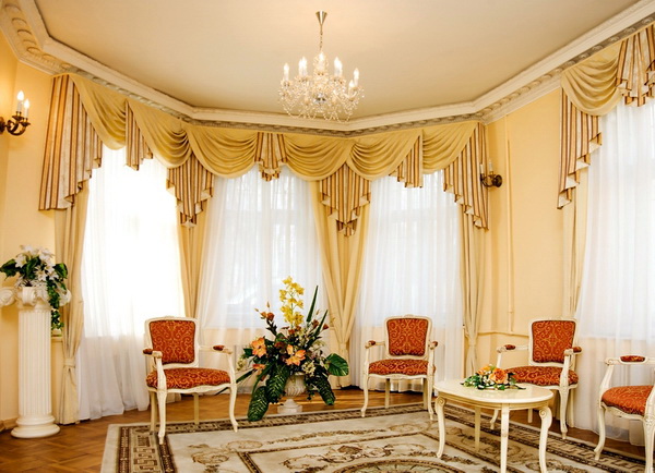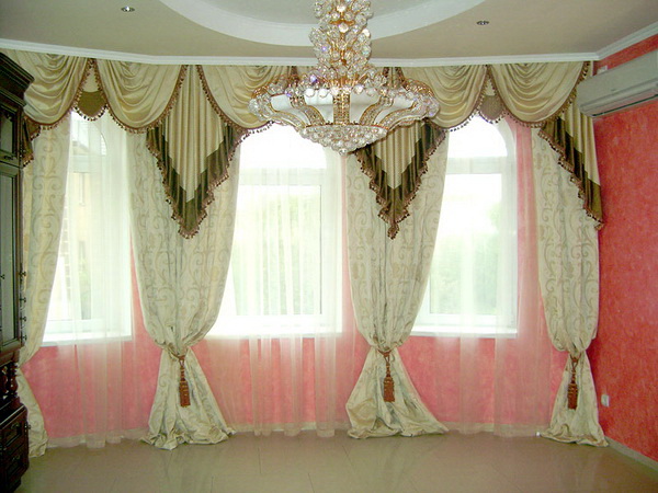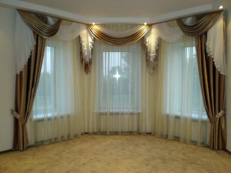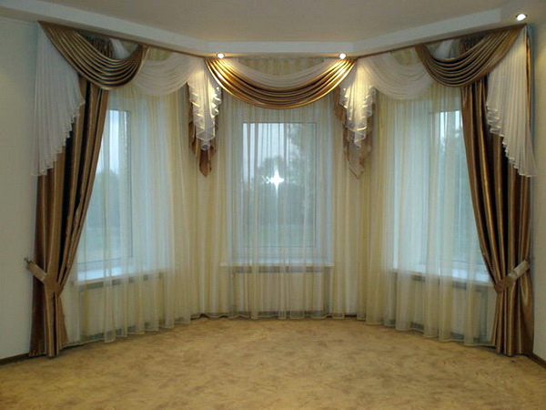 If the room has two windows side by side, you can use a common eaves, creating a single composition using a single lambrequin. Thick curtains are located on one side of each window. These windows allow you to hang curtain curtains with lots of folds. If the windows have a different width of the window sill, it is necessary to focus on the widest. Curtains should hang loose without touching the edge of the window sill. To hang the curtains on the bay or on the arched windows, it is better to use flexible polymer-metal cornices.