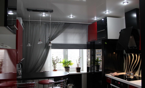 With a stretch ceiling, the cornice is hidden, and the curtains fall as if directly from the ceiling, which looks quite unusual and beautiful. A similar effect can be achieved with the help of ceiling eaves. Long curtains under the ceiling visually increase the vertical space, which is important in small apartments.